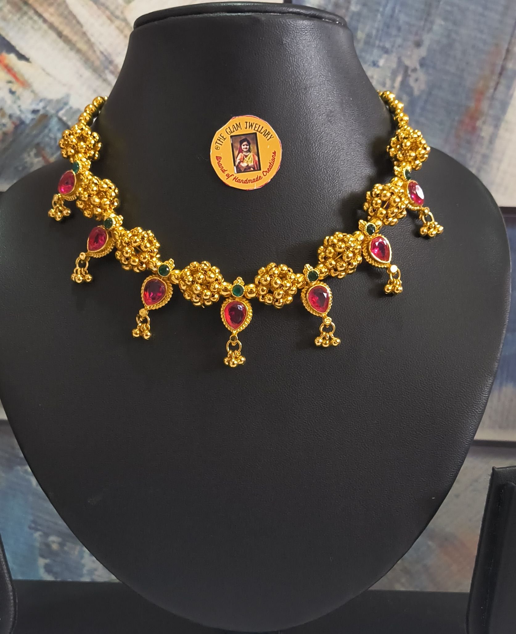 Celebrate the beauty of Maharashtrian tradition with this stunning Thushi Necklace, crafted with intricate gold bead clusters and highlighted with vibrant ruby pink and green stones. Inspired by classic temple jewellery design, this necklace reflects royal elegance and cultural charm.