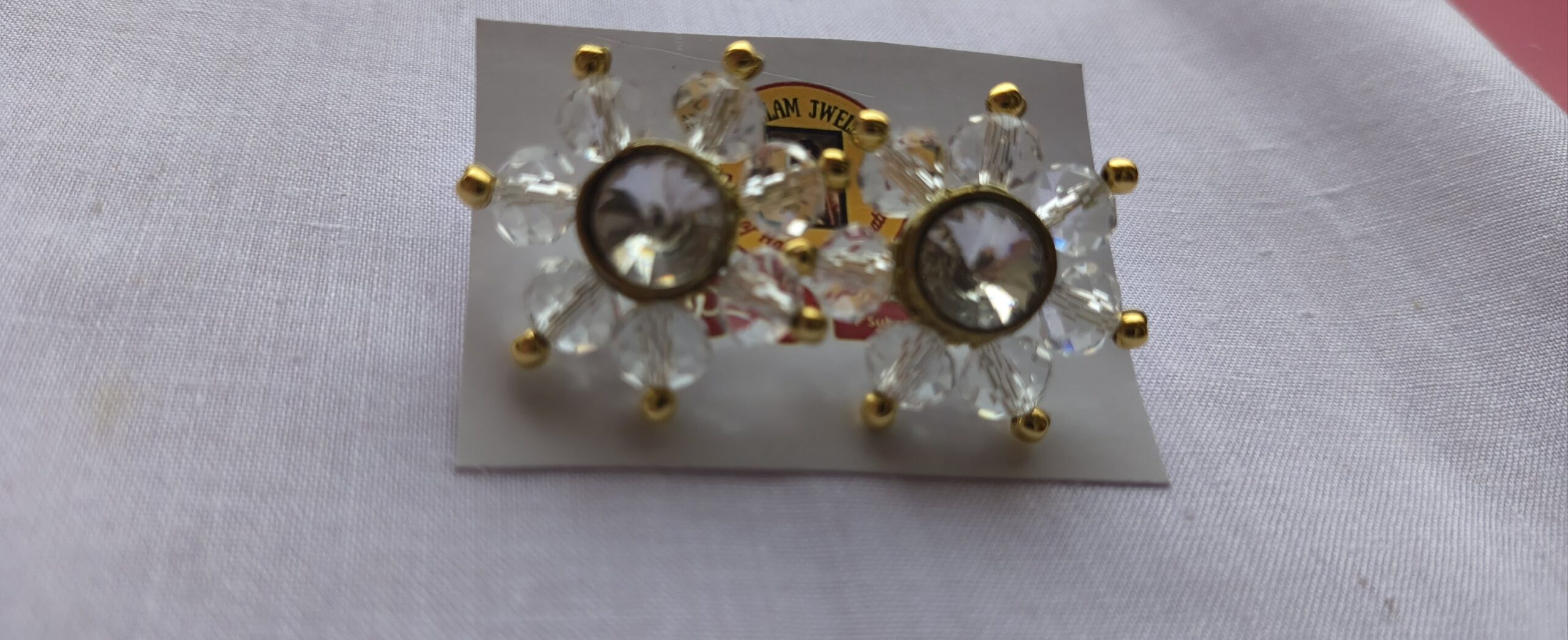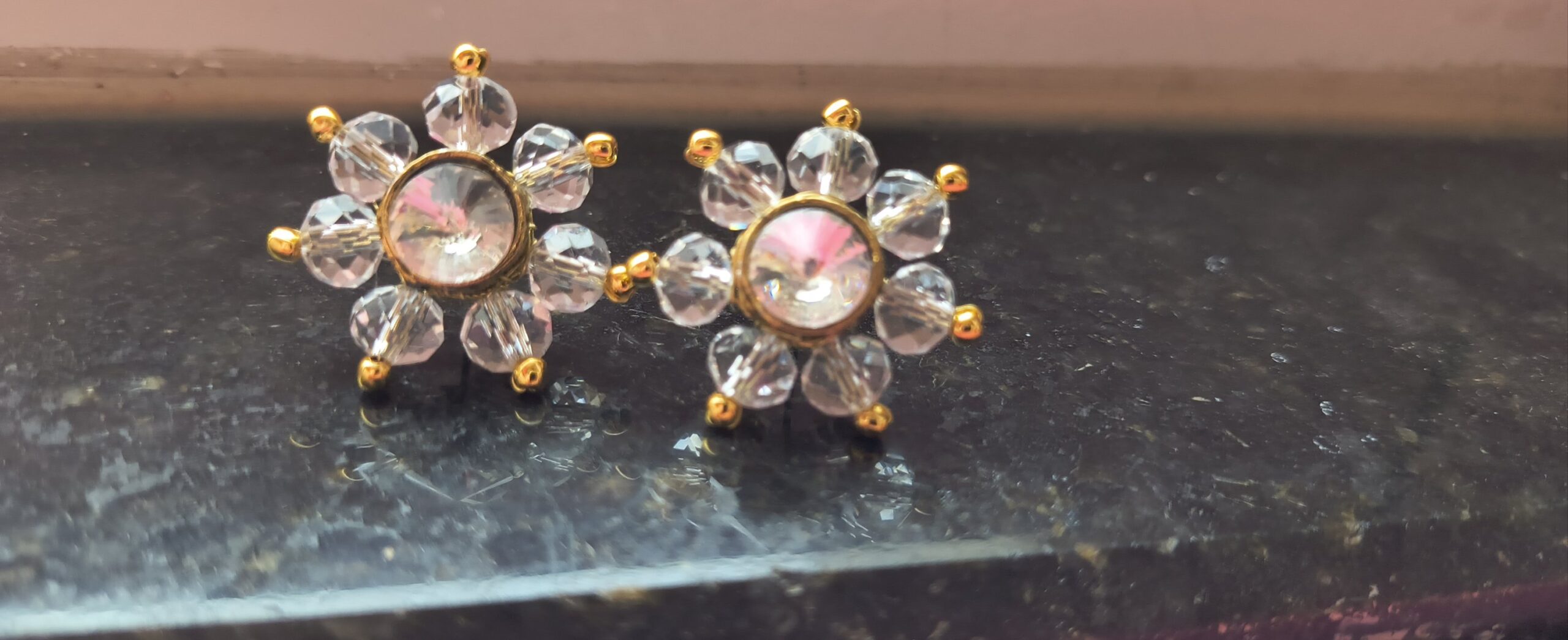 Beautiful crystal flower stud earrings featuring a radiant center stone surrounded by delicate transparent crystal beads. Lightweight, elegant, and perfect for party wear, festive occasions, or everyday styling.
