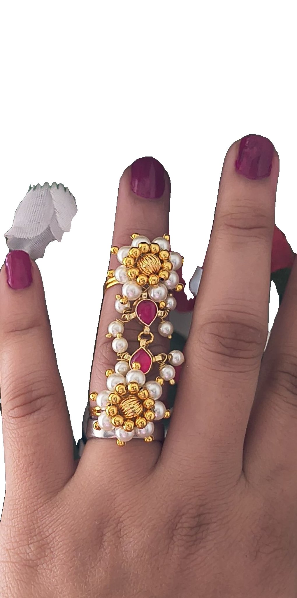 Crafted to complement bridal and festive outfits, this statement ring enhances the beauty of sarees, lehengas, gowns, and traditional attire. The combination of rich gold tones and delicate pearl embellishments creates a luxurious yet graceful appearance.