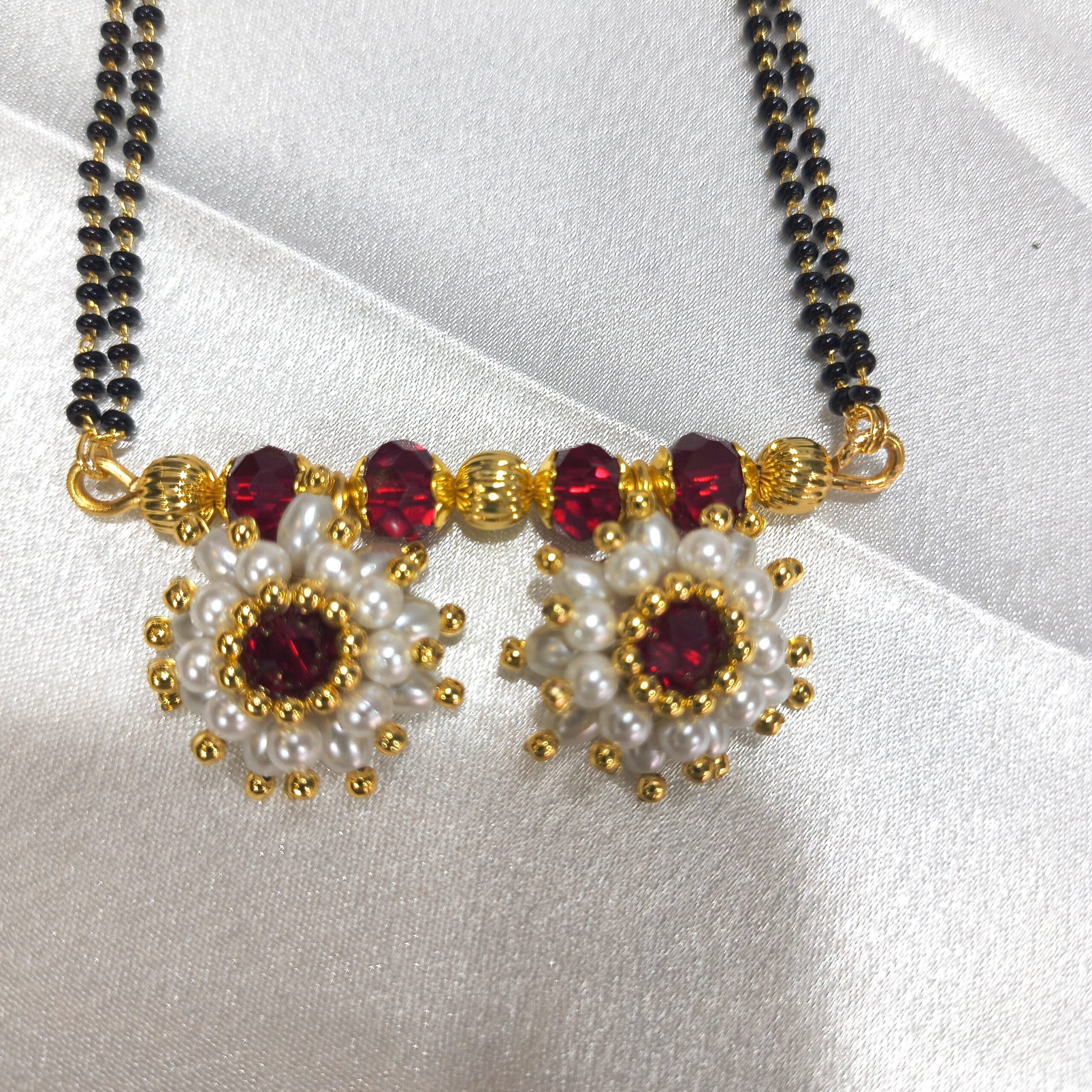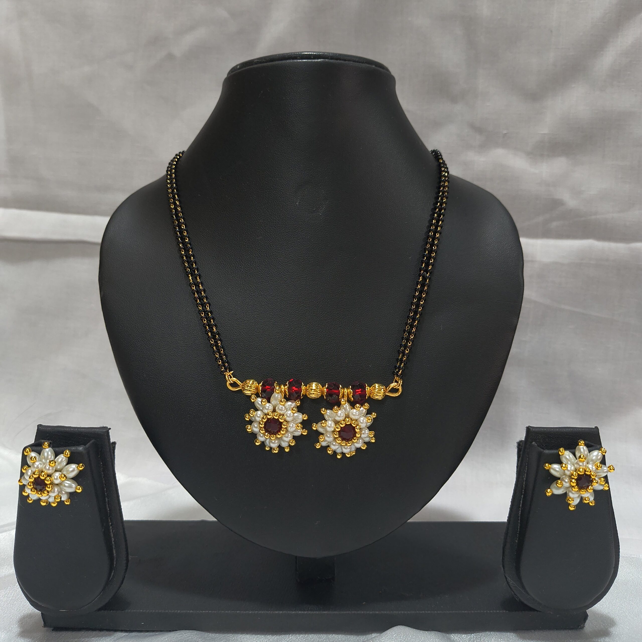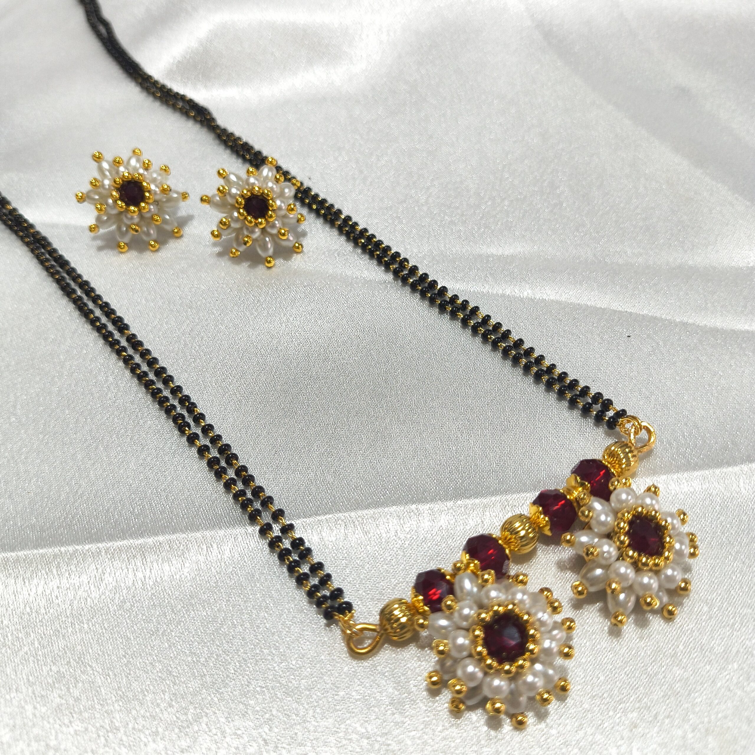 Enhance your traditional look with this elegant Mogara Mangalsutra Set with matching earrings. Designed with a classic black beaded chain, this set features a beautiful floral (mogara) pendant adorned with red stones and pearl detailing, giving it a graceful and timeless appeal.