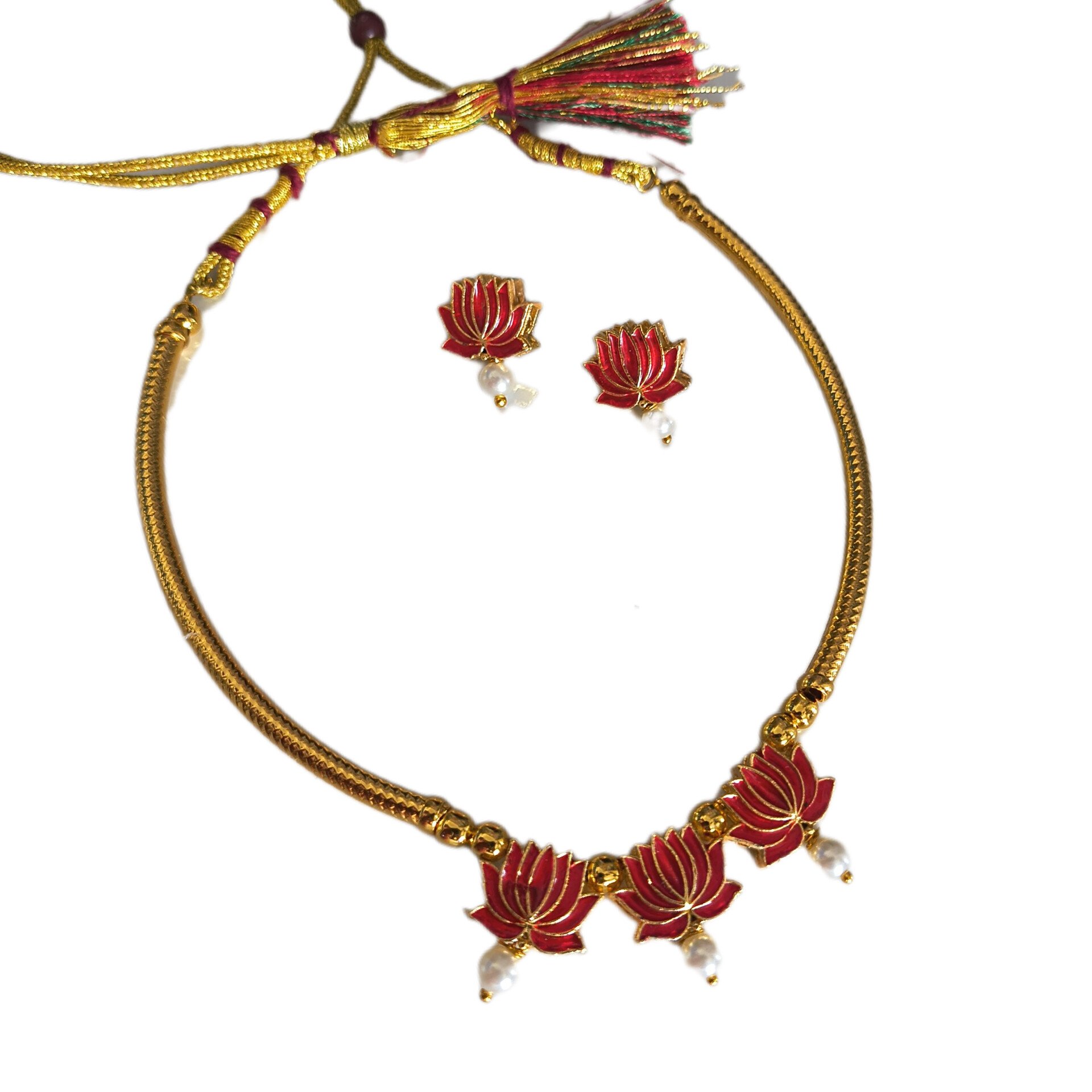Hollow Pipe Lotus Necklace Set with Earrings – Pink Traditional Jewellery.